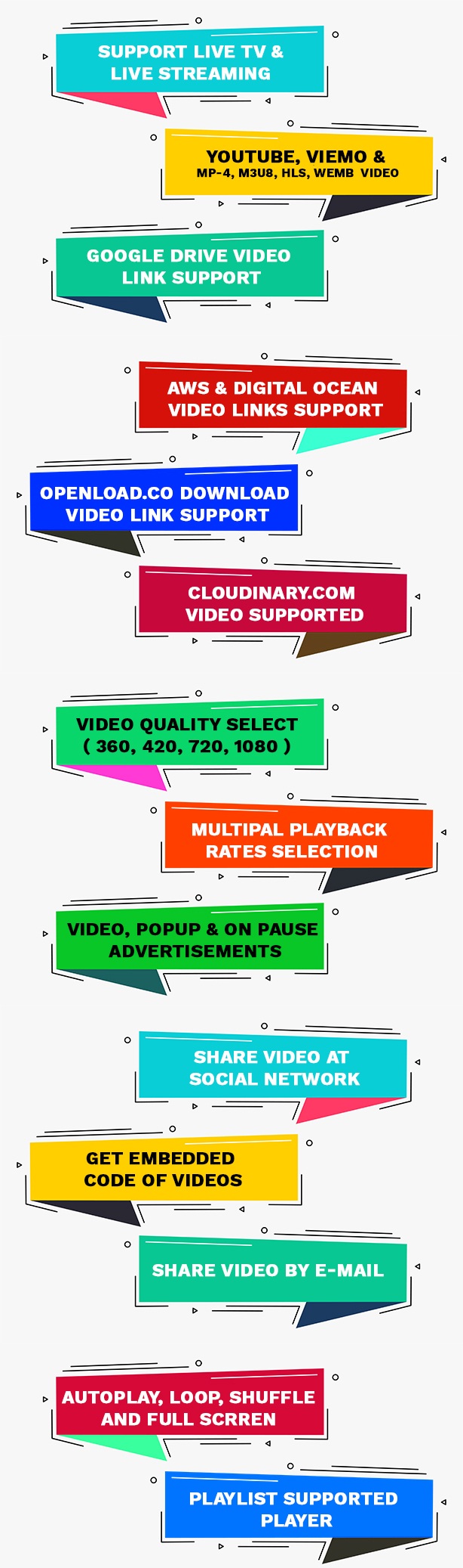 - Support YouTube, Vimeo & MP-4, m3u8, HLS, WEMB Video