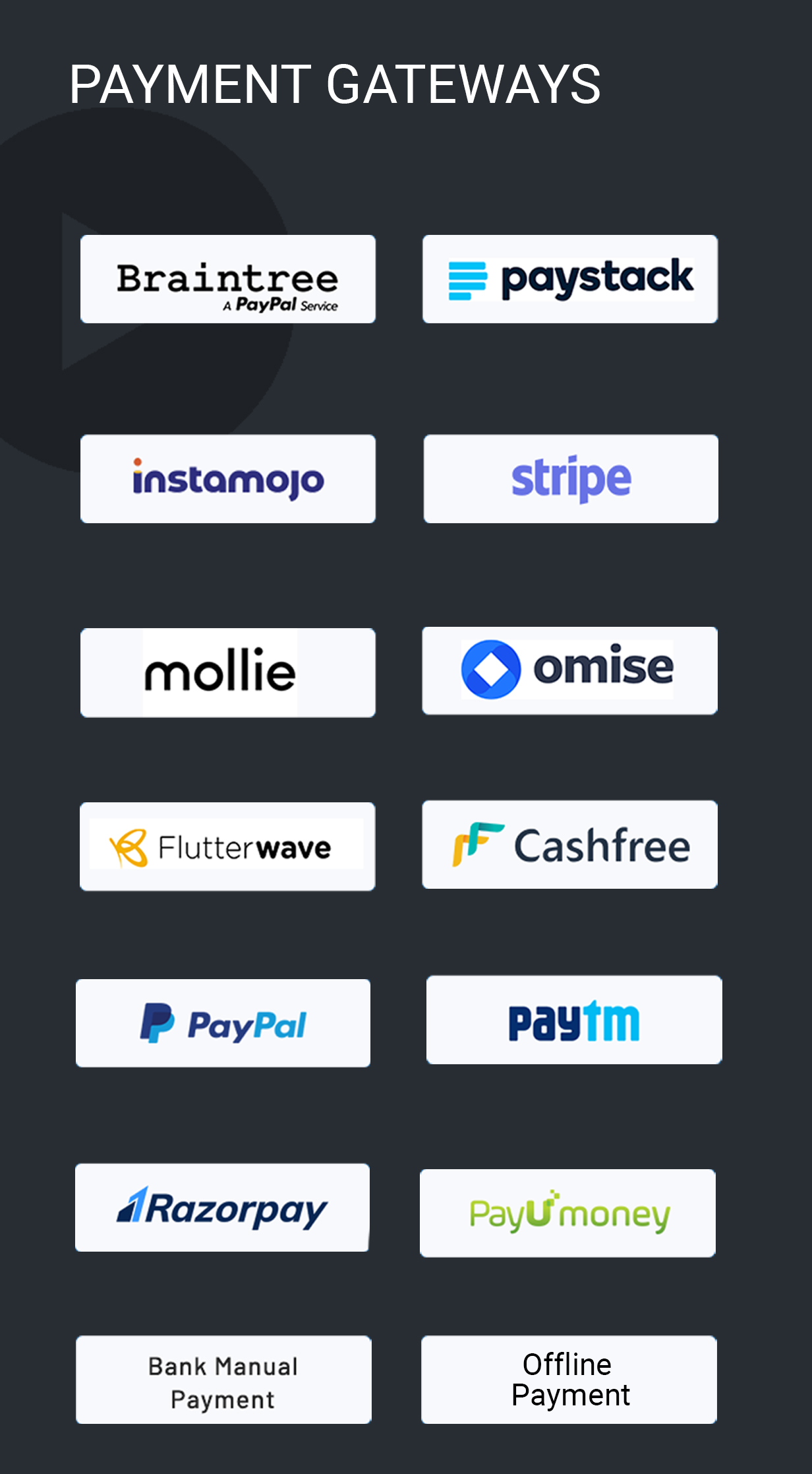 - Stripe Payment, PayPal, Mollie, Instamojo, Omise & Flutterwave Payment gateway integration